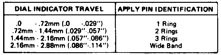 e. Make sure that band anchor pin is located inside of case, then apply 100 inch lbs. (12 Nm) torque to hex nut on side of gauge and slide dial indicator over pin J-25014-1. Check dial indicator reading and refer to chart, for proper size. Dial indicator travel is reversed, making the readings backwards. On an indicator that ranges from 0-100, a 0.020 (.5 mm) inch travel will read .080 inch (2 mm), a .060 inch (1.5 mm travel will read .040 inch (1 mm). The identification ring is located on the band end of the pin.