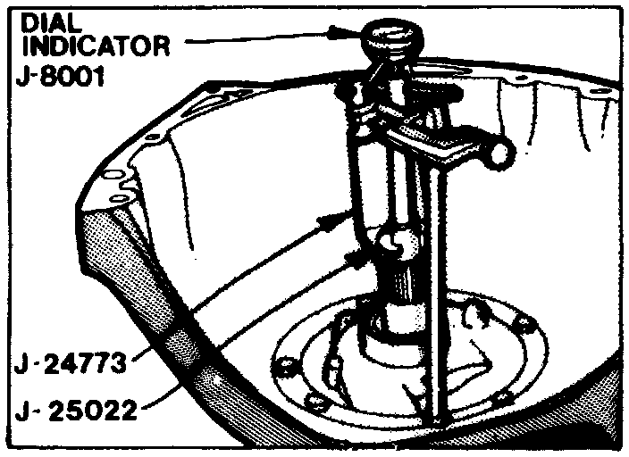 h. Remove dial indicator, clamp assembly, J-24773 and J-25022. Do not remove J-25013-5 or J-25013-1.