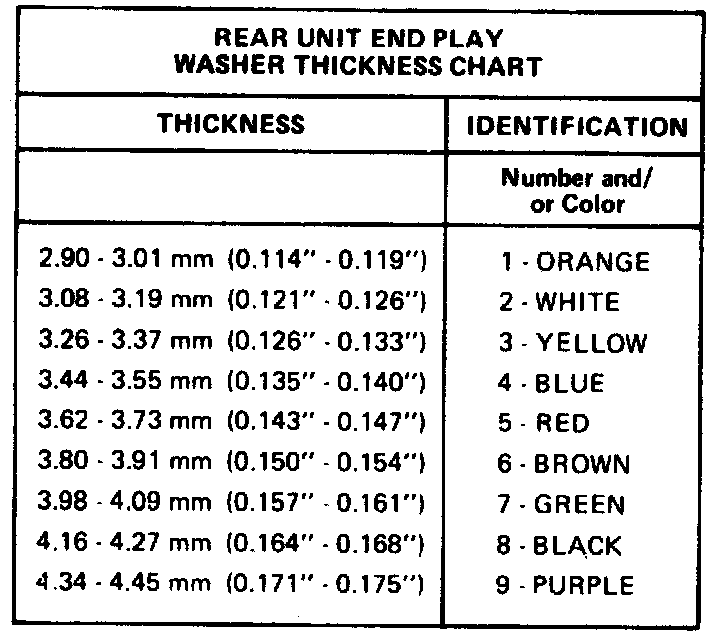 g. Pull upward on tool J-24773 and read endplay. Front unit end play should be 0.022-0.051 inch (0.56-1.3 mm). Selective washer which controls this endplay is located between the output shaft and turbine shaft. If more or less washer thickness is required to bring endplay within specifications, select proper washer from chart in image.