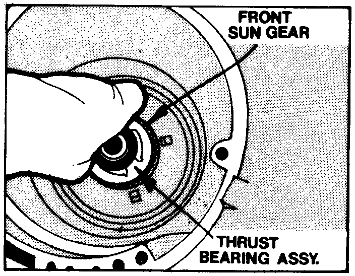 20. Remove input drum and rear sun gear, see image, then remove the tanged input drum to reverse clutch housing thrust washer from rear of input drum or reverse clutch housing. If low and reverse clutch housing assembly has to be removed, the low and reverse clutch piston travel must be checked.