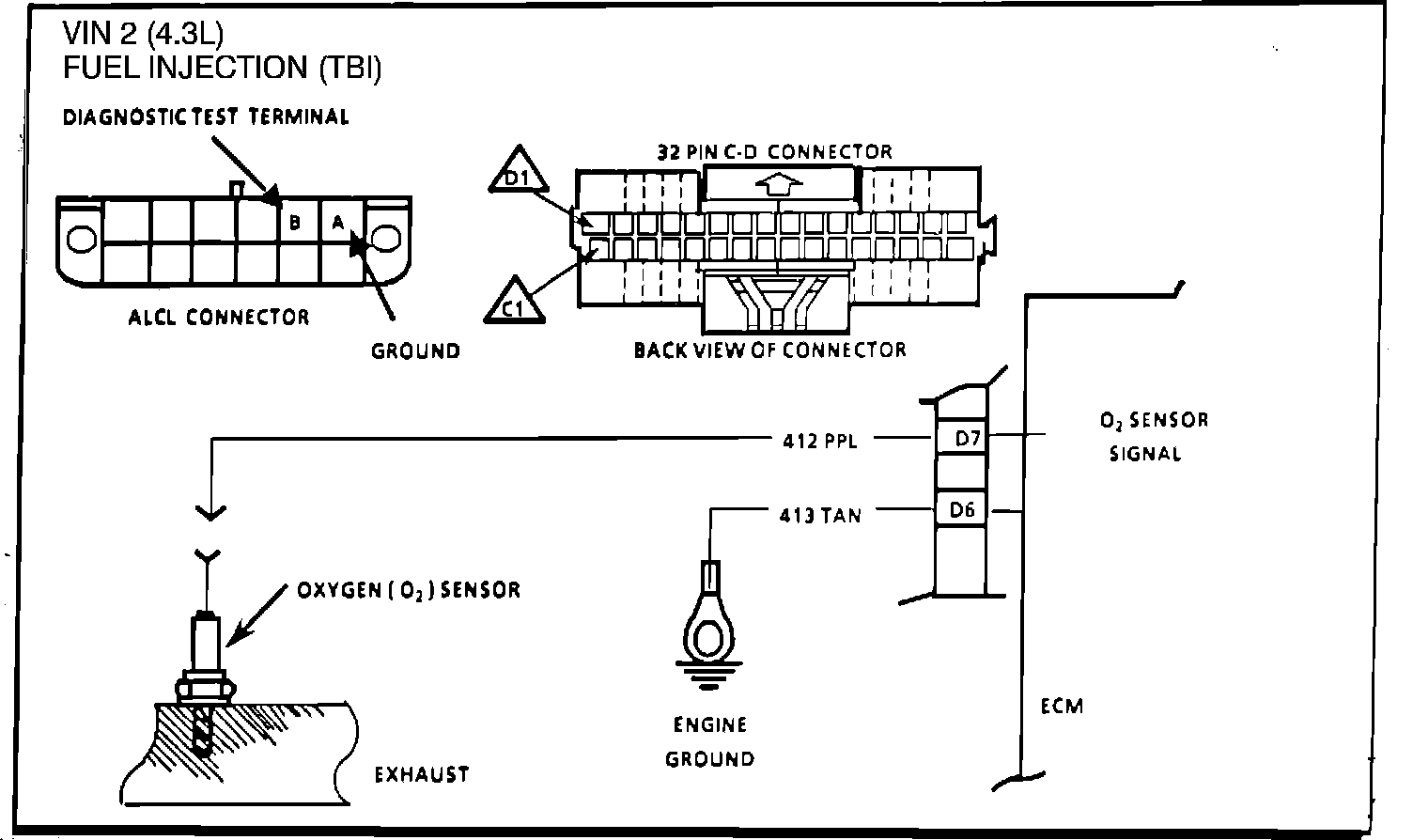 The ECM supplies a voltage of about .45 between terminals "D6 and "D7". (if measured with a 10 megohm digital voltmeter, this may read as low as .32 volts). The O2 sensor varies the voltage within a range of about 1 volt if the exhaust is rich, down through about .10 volt if exhaust is lean.