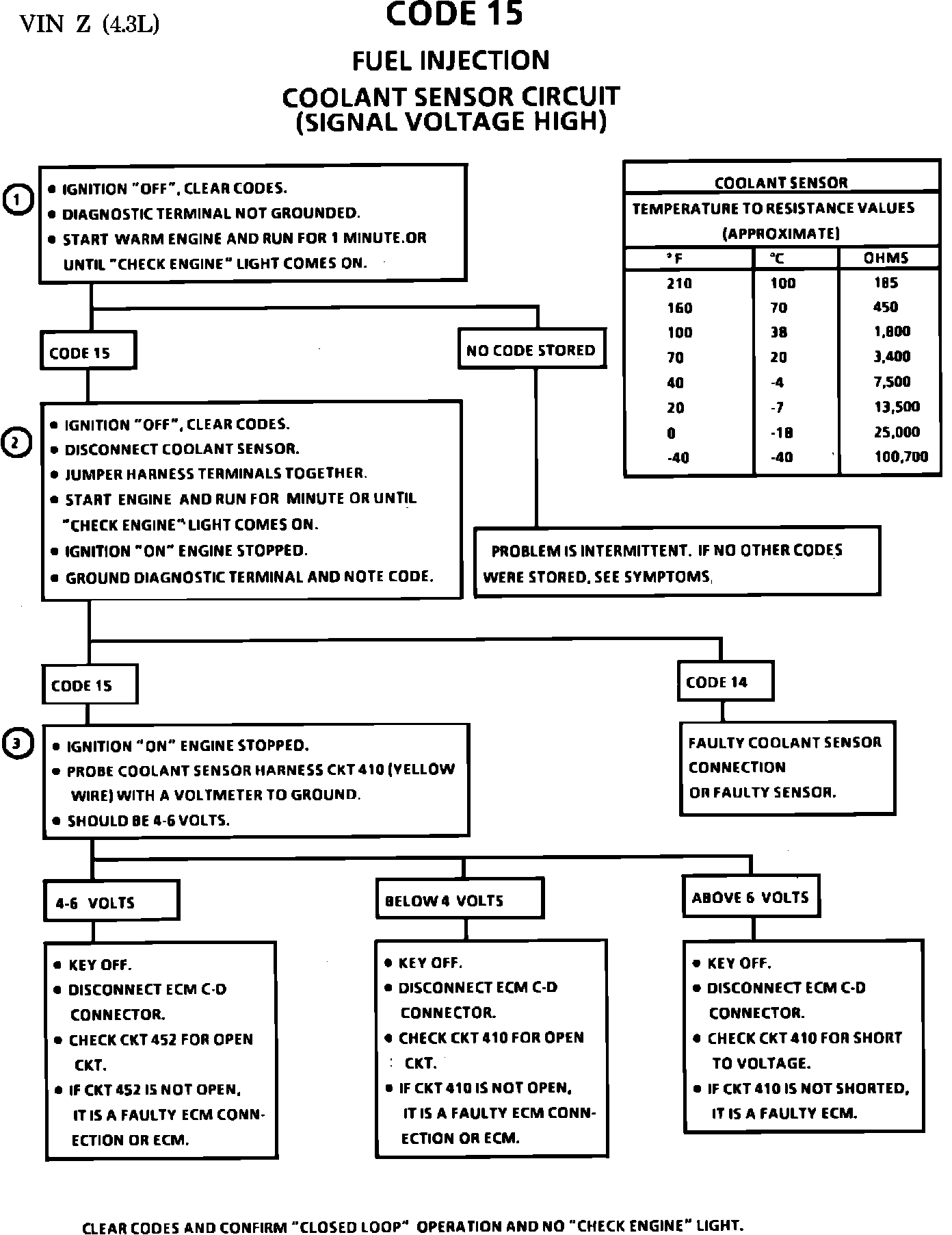 3. If Code 15 repeats, the problem is an open CKT 410, 452, a poor connection at the ECM or sensor, or a faulty ECM.
