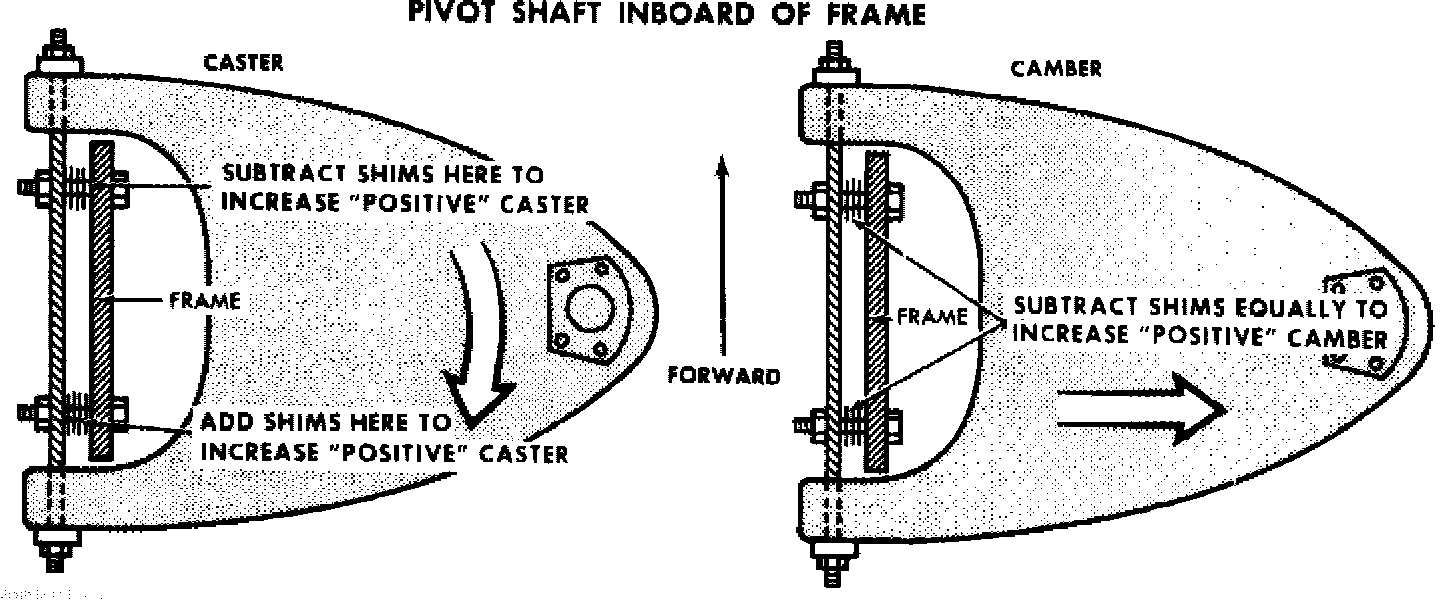 Caster and camber adjustments are made by placing shims between the upper pivot shafts and frame, Fig. 1. Both adjustments can be made at the same time. In order to remove or install shims, raise car to remove weight from front wheel, then loosen control arm shaft-to-frame bolts. Shim pack thickness should not exceed .40 inch. Also, difference between front and rear shim packs should not exceed 3/8 inch maximum.
