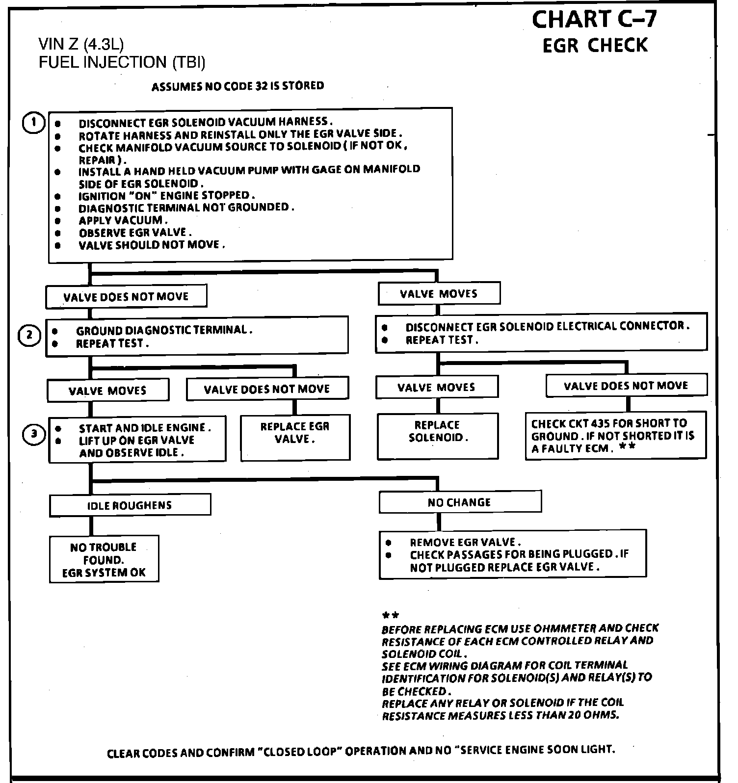 The Exhaust Gas Recirculation (EGR) valve is controlled by a normally open solenoid (allows vacuum to pass when energized). The ECM energizes the solenoid to turn the EGR on, and monitors EGR flow with the EGR temperature switch. Code The Exhaust Gas Recirculation (EGR) valve is controlled by a normally open solenoid (allows vacuum to pass when energized). The ECM energizes the solenoid to turn the EGR on, and monitors EGR flow with the EGR temperature switch. Code 32 will detect a faulty solenoid, temperature switch, or vacuum supply. Chart C-7 checks for plugged EGR passages, a sticking EGR valve, or a stuck open solenoid.