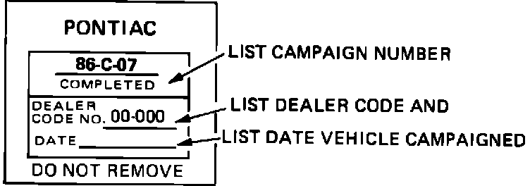 Each vehicle modified in accordance with the instructions outlined in this Product Campaign Bulletin will require a "Campaign Identification Label". Each label provides a space to include the campaign number, the five digit dealer code of the dealer performing the campaign service, and the date vehicle was campaigned. This information may be inserted with a typewriter or ballpoint pen. Install the label only on a clean, dry surface of the radiator baffle where it is readily visible. Close hood. (Additional campaign labels are available on stationery order as Form 7901-709).