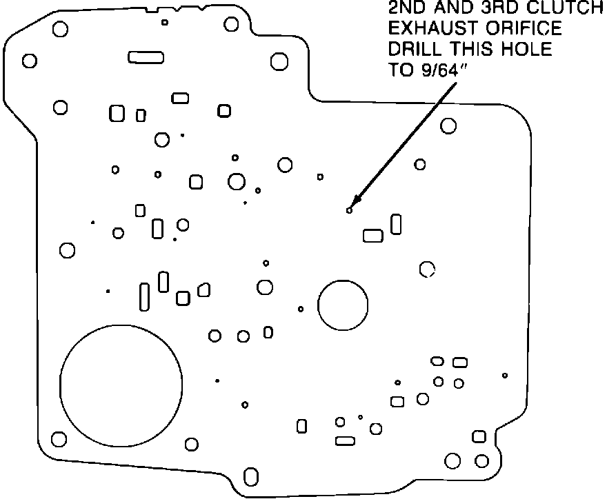 4. On a 1984 or 1985 THM 200C transmission built prior to September 25, 1985 (Julian Date 268), remove the spacer plate and drill the 2nd and 3rd clutch exhaust orifice out to 3.57 mm (9/64") (Figure 3). Using a 6.3 mm drill bit, hand chamfer both sides of the hole, slightly, to remove burrs and rough edges.
