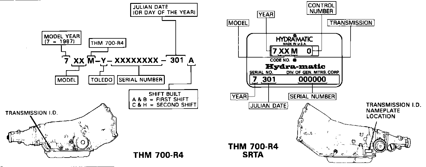 October 28, 1986, Julian date 301, ten-vane pumps for all 1987 THM 700-R4 production and Service Replacement Transmission Assembly (SRTA) models.