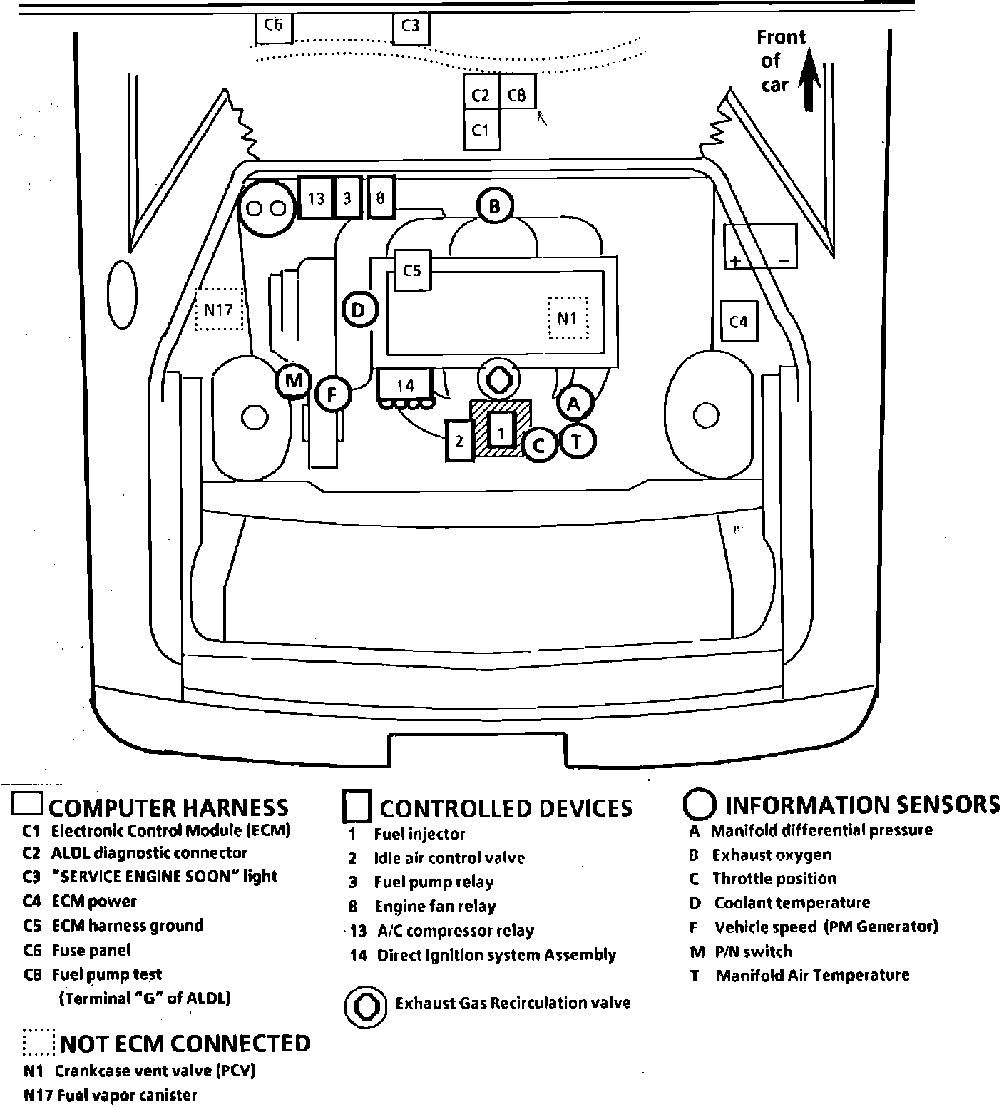 Fig. 64 Emission Component Location. 1987-88 Fiero W/4-151/2.5L, TBI: