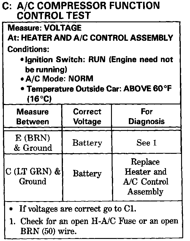 ^ If battery voltage is not present at the A/C Compressor Control Relay when the jumpers are connected, check the wiring between switches for an open (see schematic).