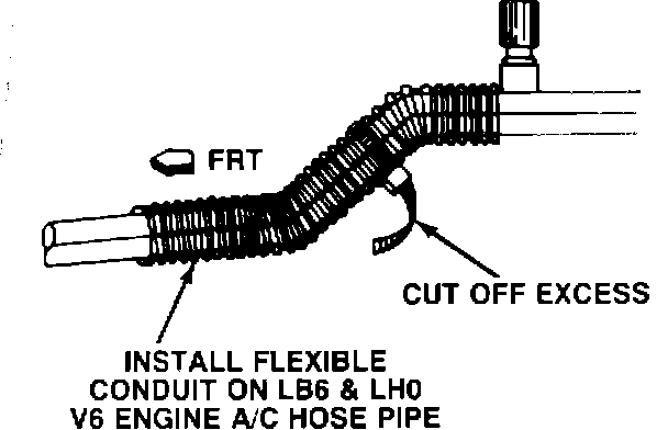 1. Slide a 6 inch piece of the flexible conduit on to the A/C pipe just in front of the valve, as shown in Figure 1 and 3, with the slit positioned on the bottom of the pipe.