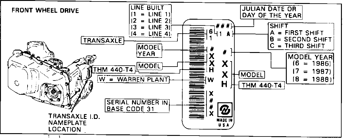 FIGURE 1 - THM 440-T4 TRANSAXLE IDENTIFICATION INFORMATION: