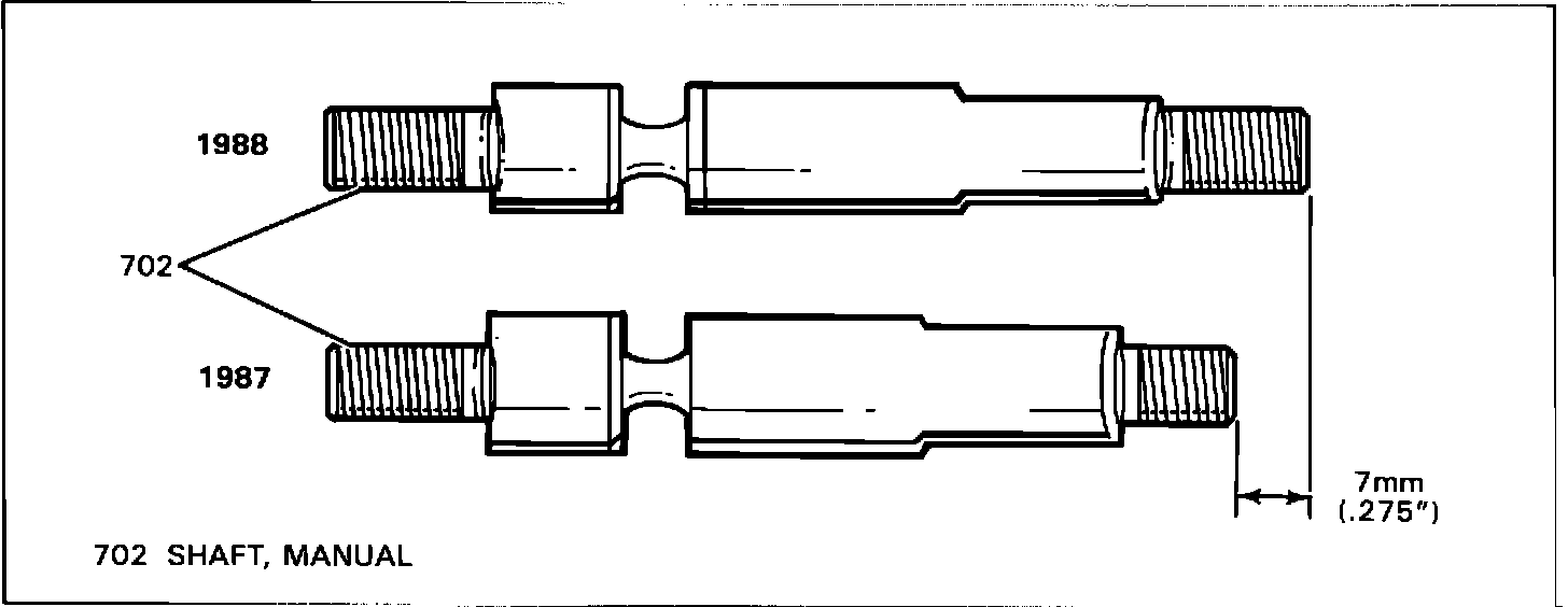 A new manual shaft (702) that is 7 mm (.276") longer is used on all 1988 THM 440-T4 transaxles. This longer manual shaft was first used on two 1987 model THM 440-T4 transaxles (7ADH, 7AHH) and is not interchangeable with the shorter manual shaft.