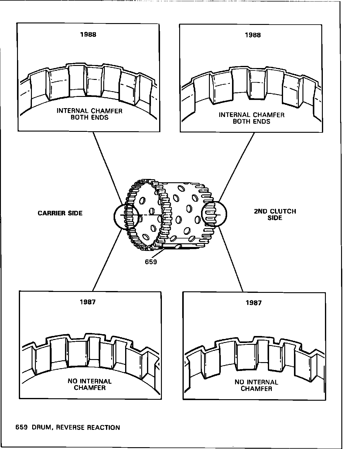 A new reverse reaction drum (659) for all 1988 THM 440-T4 transaxles. The change to the reverse reaction drum is identified by a chamfer on both ends of the drum.