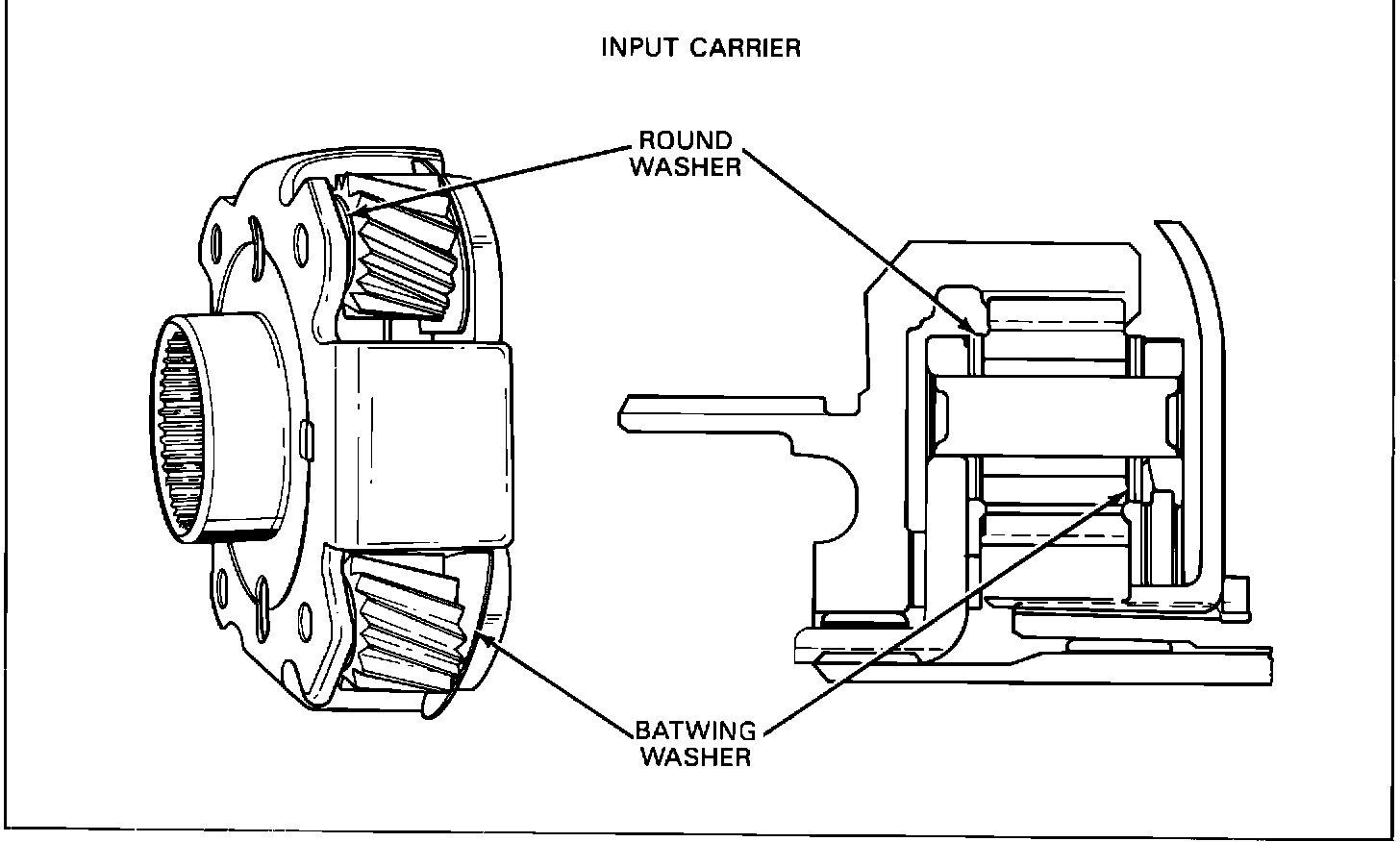When servicing a THM 125/125C transaxle and inspection of the Input Carrier reveals any of the Input Carrier Pinion Washers are worn and/or missing, a new input carrier must be installed. This Input Carrier with new Nibron coating may be used on all past models.