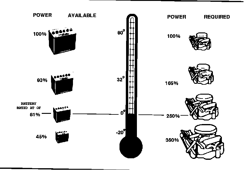 Figure 1 shows what happens to available battery power and the power required to start the engine at different outside temperatures.
