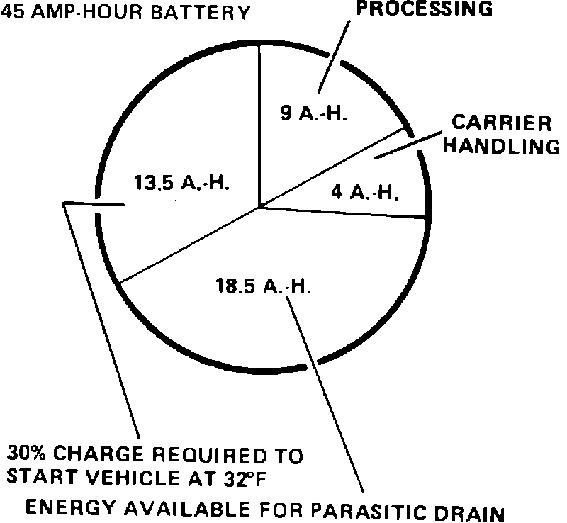 Figure 2 shows a typical amount of current used in getting a vehicle built and delivered to the dealer, how much is available for electrical devices, and how much is necessary to start the vehicle. The battery begins to be discharged at the time it is connected. Current is used during plant build, carrier handling, dealer storage, and new car preparation. During this entire period, the vehicle is never driven long enough nor at a high enough RPM to bring the battery back up to a full state of charge.