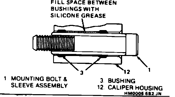 When servicing the caliper, the caliper bolts should be cleaned and the space between the caliper bolt bushings should be filled with silicone grease such as Part Number 1052863 or equivalent. This will prevent the caliper dragging or binding on the mounting bolts. Refer to Figure 3.