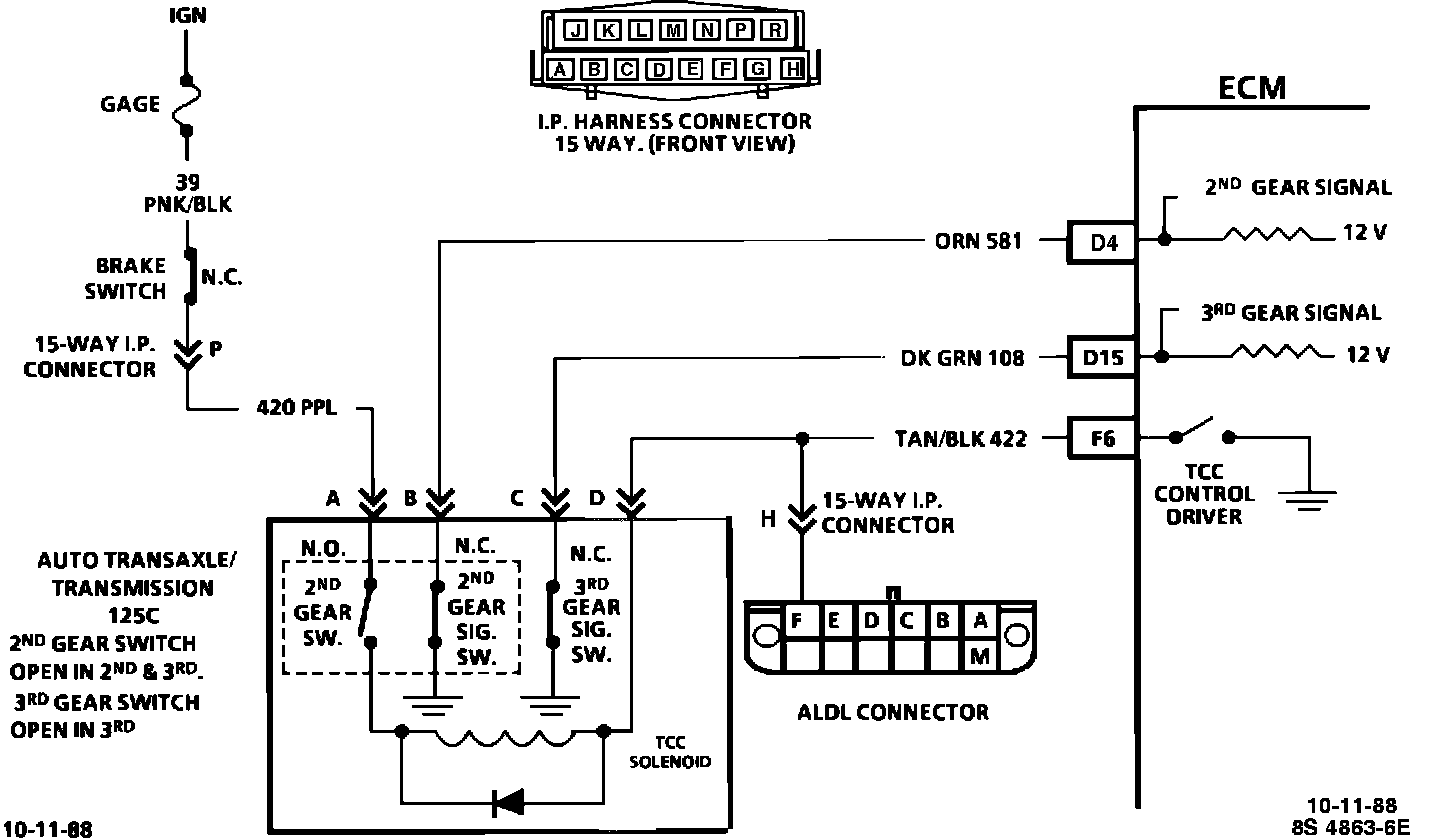 The 2nd gear signal switch in this vehicle should be open in 2nd and 3rd gear. The ECM uses this 2nd gear signal to disengage the TCC when downshifting. The 3rd gear switch should be open in 3rd gear. 1st Gear = 2nd gear switch open 2nd gear signal switch closed 3rd gear signal switch closed