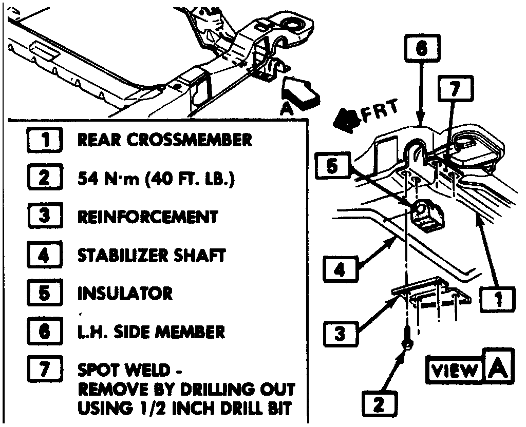 10. Drill through spot weld located between rear holes of left front stabilizer bar rear holes of left front stabilizer bar mounting, using 1/2 inch bit