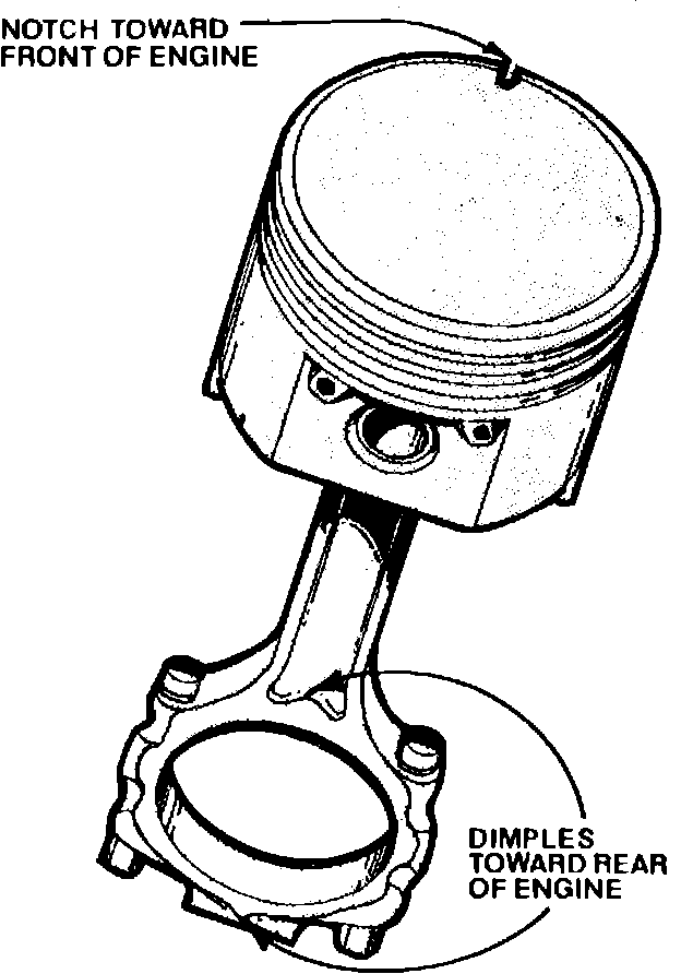 Assemble piston to rod with notch on piston facing toward front of engine and the raised notch side of rod at bearing end facing toward rear of engine, Fig. 9.
