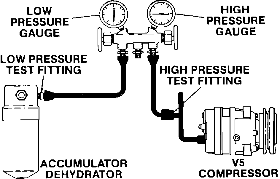 e. Refrigerant system undercharged. This condition may exist when suction pressure is below 35 psi during the high load test. The accumulator (A/D) and the suction line before the A/D, will be warm if charge is low. Add one can of refrigerant and recheck. Pressures should come into white area. If so, find source of refrigerant loss and repair leak. Evacuate and charge system with correct refrigerant amount.