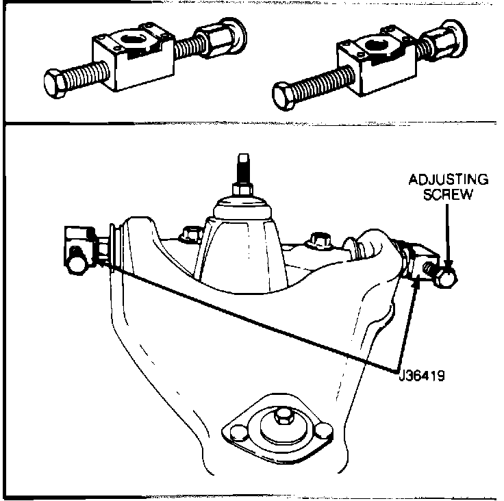 5. NOTICE: THIS TOOL WILL ALLOW FOR OUTWARD ADJUSTMENTS ONLY. INWARD ADJUSTMENTS MUST BE MADE MANUALLY - OR - THE UPPER ARM CAN BE MOVED TO A FULL INWARD POSITION AND THEN ADJUSTED OUTWARD AS REQUIRED USING J 36419. TURN APPROPRIATE ADJUSTING SCREW CLOCKWISE TO MOVE UPPER ARM OUTWARD (SEE FIGURE 2).