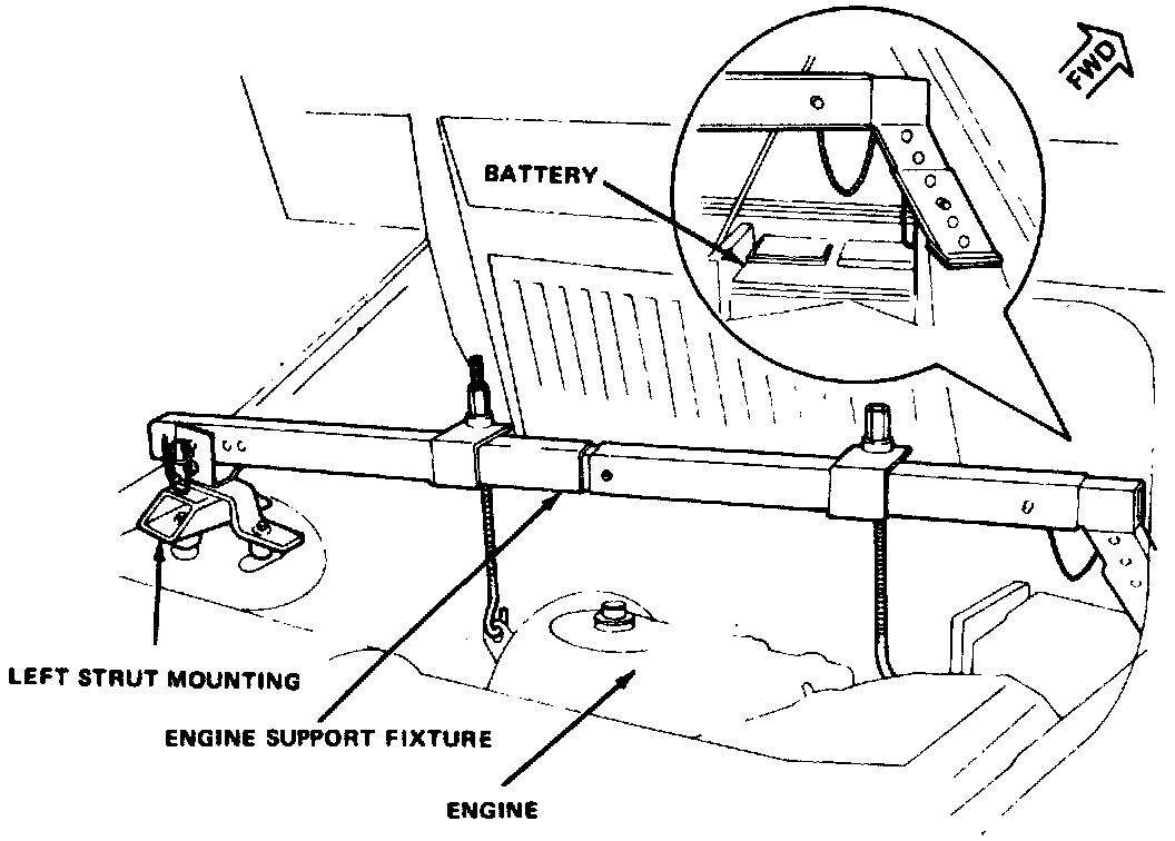 4. Install engine support fixture tool No. J-28467 or equivalent, see accompanying figure.