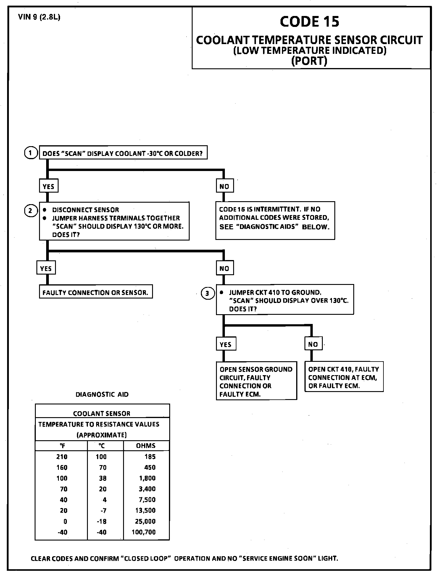 CODE 15 - COOLANT TEMPERATURE SENSOR (LOW TEMPERATURE INDICATED) 2.8L (PORT)