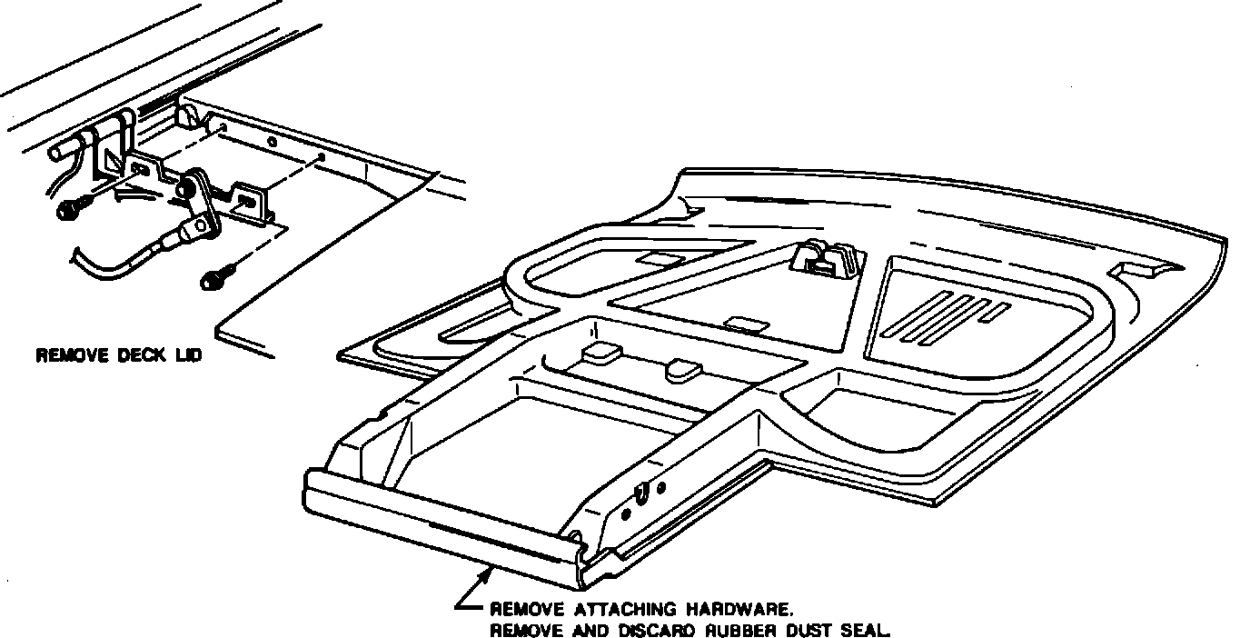 b. Remove rear encine compartment lid. Remove rubber dust seal and retaining clips from leading edge (front) of decklid assembly (and leave off) (ILLUSTRATION C).