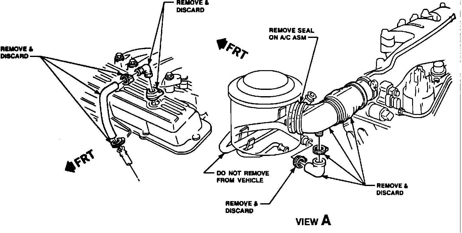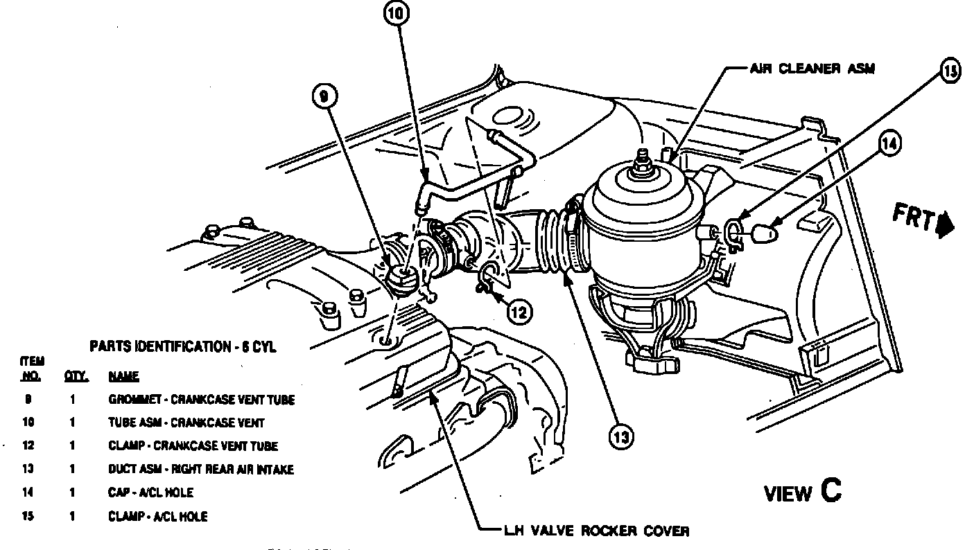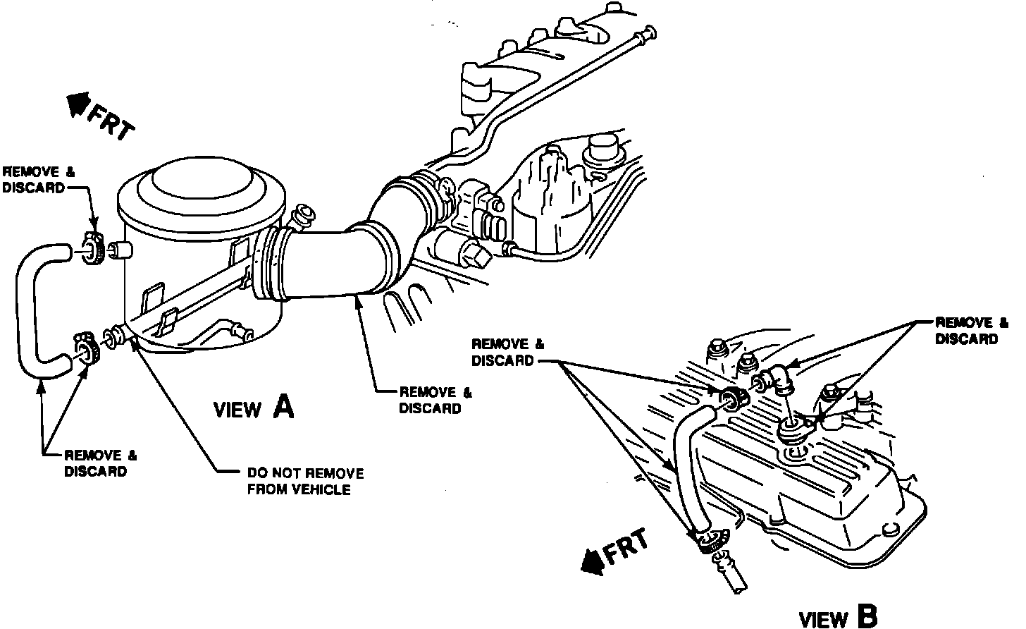 c. Remove air intake duct assembly (ILLUSTRATION D & E). Remove foam rubber seal on air cleaner housing neck (85-86 only). Remove PCV vent tube elbow(s), clamps and hoses at engine and air cleaner. DO NOT remove PCV vent tube mounted on forward engine compartment wall.