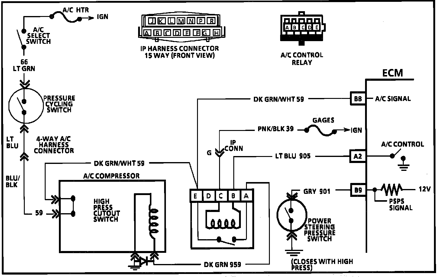 Voltage is supplied to the A/C Clutch Control relay on CKT 59 by the A/C Control Switch. This same voltage is supplied as a signal to ECM pin "B8". After a time delay of about 1/2 second the ECM will ground terminal "A2", CKT 905, and close the A/C relay contacts.