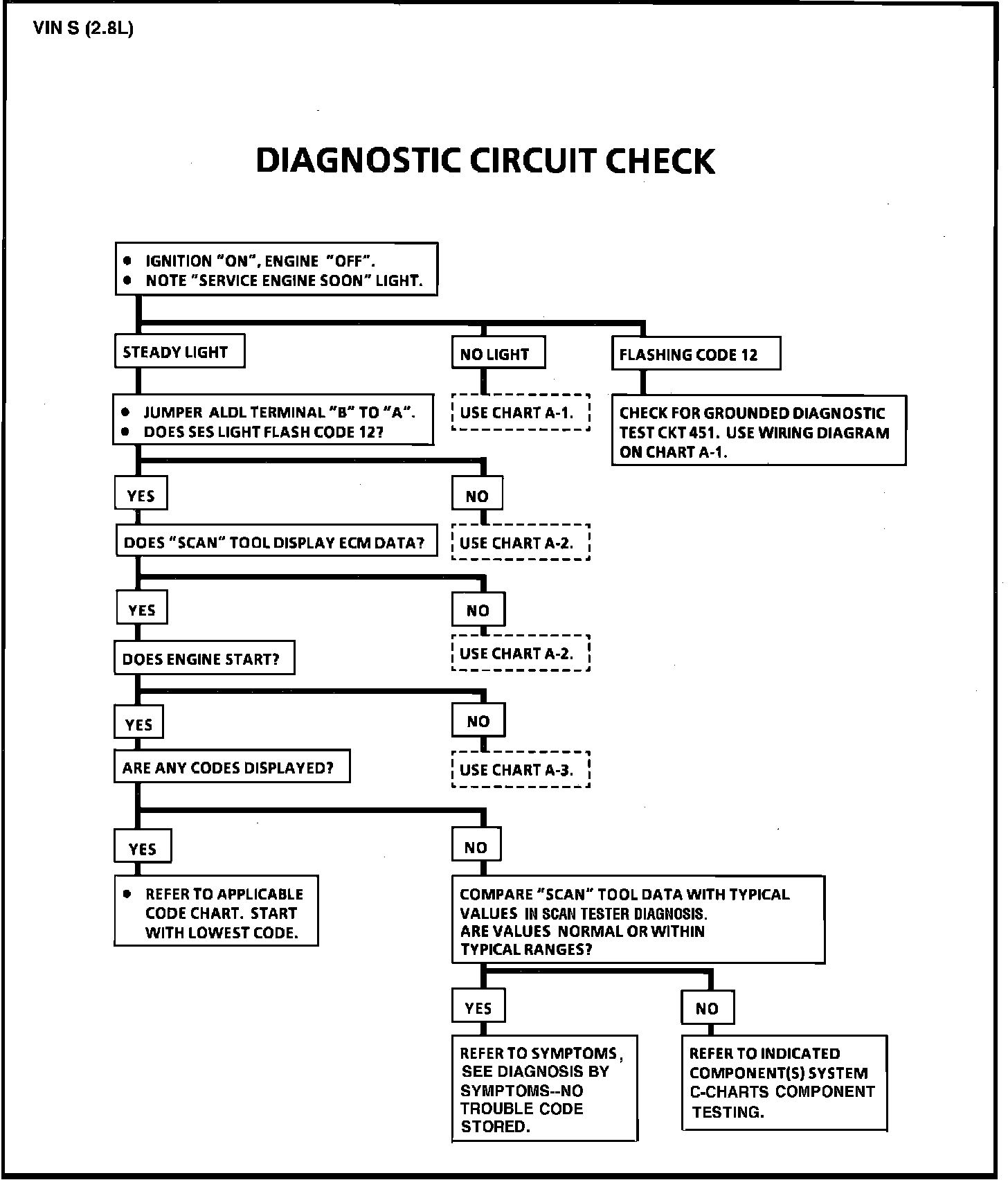 The Diagnostic Circuit Check is an organized approach to identifying a problem created by an Electronic Engine Control System malfunction. It is the starting point for any driveability complaint diagnosis, because it directs the Service Technician to the next logical step in diagnosing the complaint. The "Scan Data" values may be used for comparison, after completing the Diagnostic Circuit Check and finding the on-board diagnostics functioning properly and no trouble codes displayed. The "Typical Values" are an average of display values recorded from normally operating vehicles and are intended to represent what a normally functioning system would typically display. A "SCAN" TOOL THAT DISPLAYS FAULTY DATA SHOULD NOT BE USED, AND THE PROBLEM SHOULD BE REPORTED TO THE MANUFACTURER. THE USE OF A FAULTY "SCAN" CAN RESULT IN MISDIAGNOSIS AND UNNECESSARY PARTS REPLACEMENT. Only the parameters listed are used for diagnosis. If a "Scan" reads other parameters, the values are not recommended. If all values are within the range illustrated, refer to "Diagnosis by Symptoms, No Trouble Code Stored".