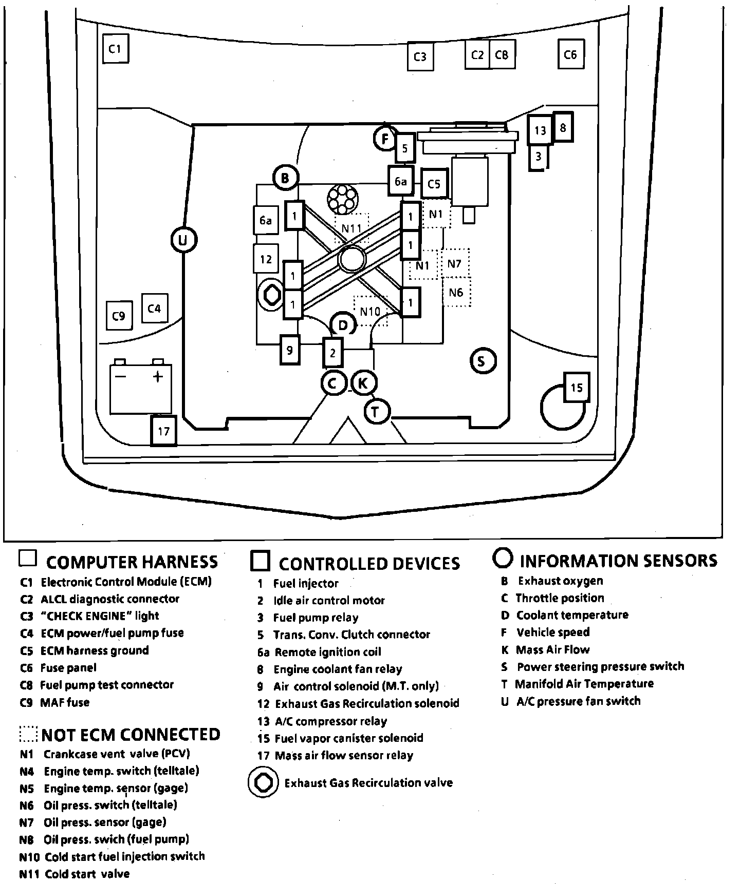 Fig. 39 Emission Component Location. 1985-86 Camaro W/V6-173/2.8L, PFI: