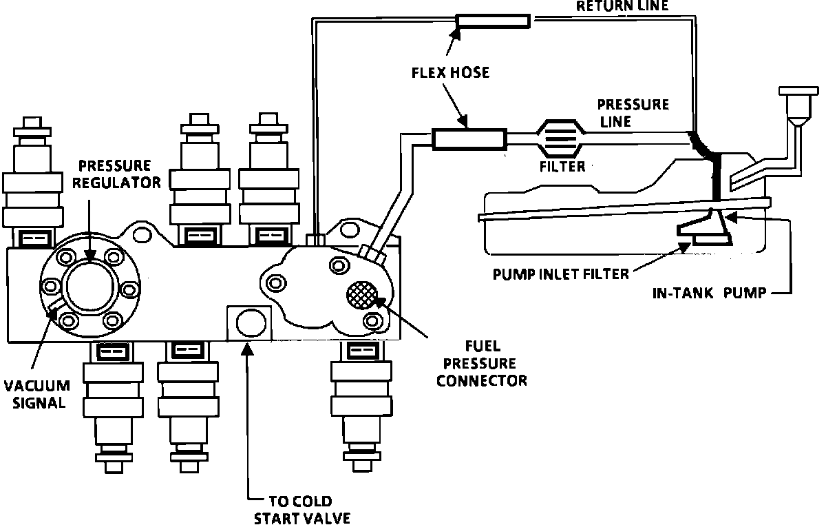 When the ignition switch is turned "ON", the Electronic Control Module (ECM) will turn "ON" the in-tank fuel pump. It will remain "ON" as long as the engine is cranking or running, and the ECM is receiving High Energy Ignition (HEI) distributor reference pulses. If there are no reference pulses, the ECM will shut "OFF" the fuel pump within 2 seconds after key "ON" or engine stopped. The pump will deliver fuel to the fuel rail and injectors, then to the pressure regulator, where the system pressure is controlled to about 234 to 317 kPa (34 to 46 psi). Excess fuel is then returned to the fuel tank.