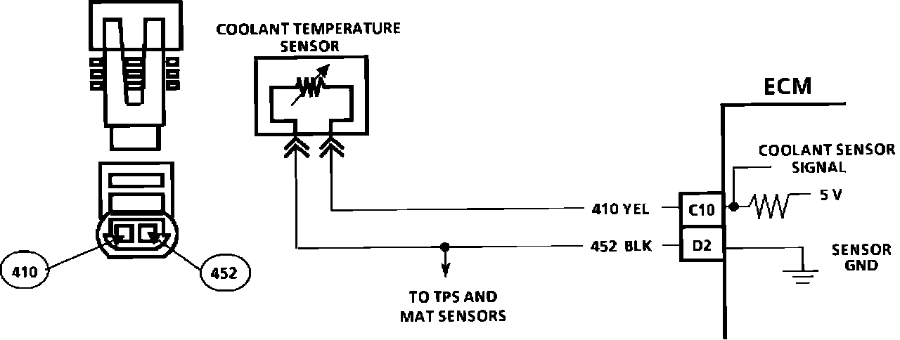 The coolant temperature sensor uses a thermistor to control the signal voltage to the Electronic Control Module (ECM). The ECM applies a voltage on CKT 410 to the sensor. When the engine is cold, the sensor (thermistor) resistance is high, therefore the ECM will see high signal voltage. As the engine warms, the sensor resistance becomes less, and the voltage drops. At normal engine operating temperature (85 degrees C to 95 degrees C) the voltage will measure about 1.5 to 2.0 volts.