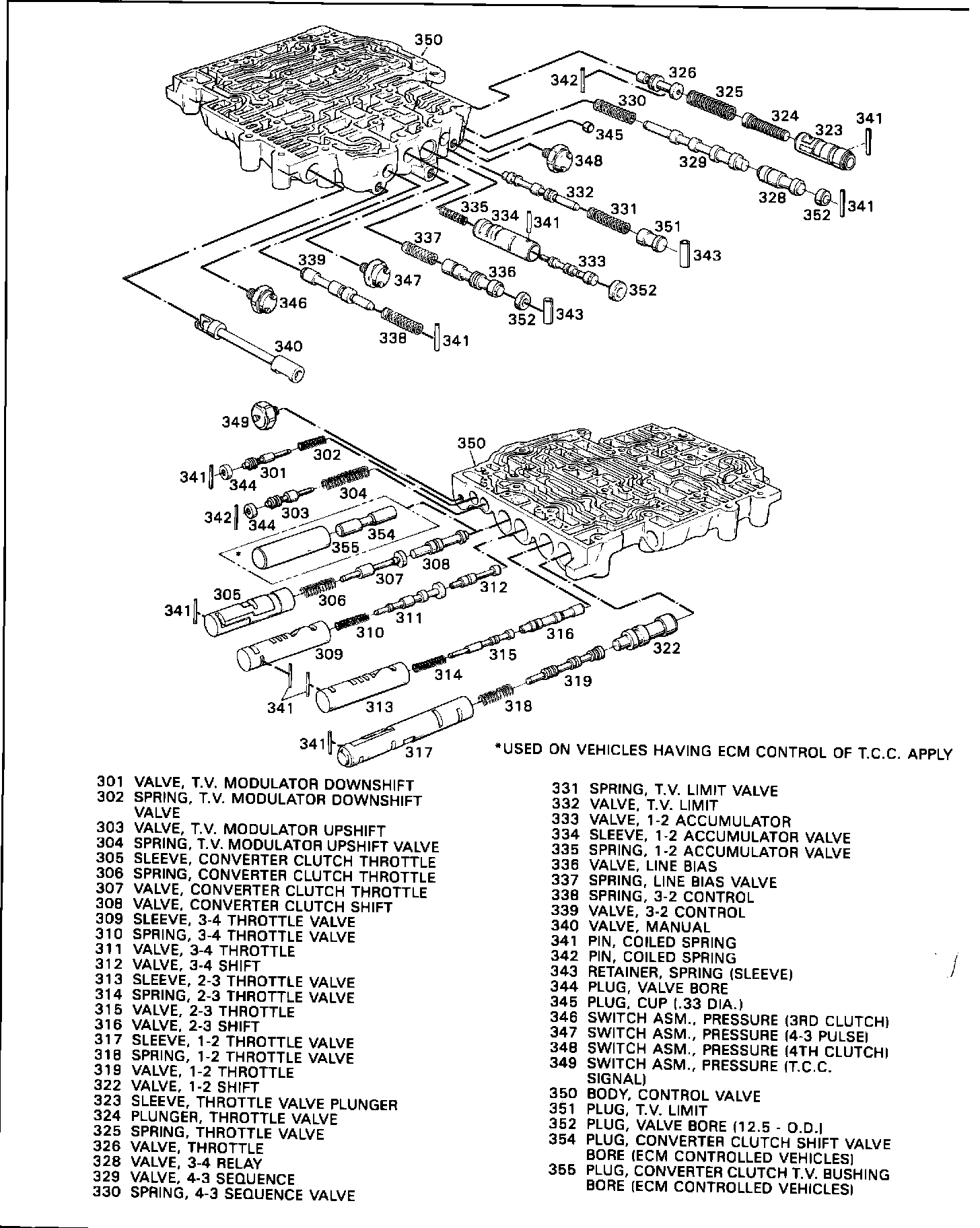 A new Control Valve Assembly (67) and Valve Body Spacer Plate for all 1988 THM 700-R4 transmissions. The new Control Valve Assembly consists of revised 1-2 and 3-4 shift valve trains. With the change to the 1-2 valve train, two valves and one sleeve have been eliminated. The lo range downshift valve (321), the lo range control sleeve (320) and the 1-2 lo range upshift valve (353) have been eliminated from the 1988 THM 700-R4 Control Valve Assembly.