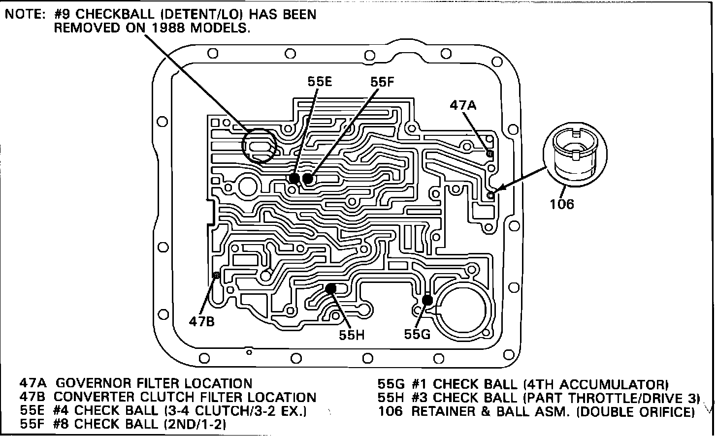With the changes made to the control valve assembly, the #9 Lo-Detent Checkball has been eliminated from 1988 THM 700-R4 transmissions.