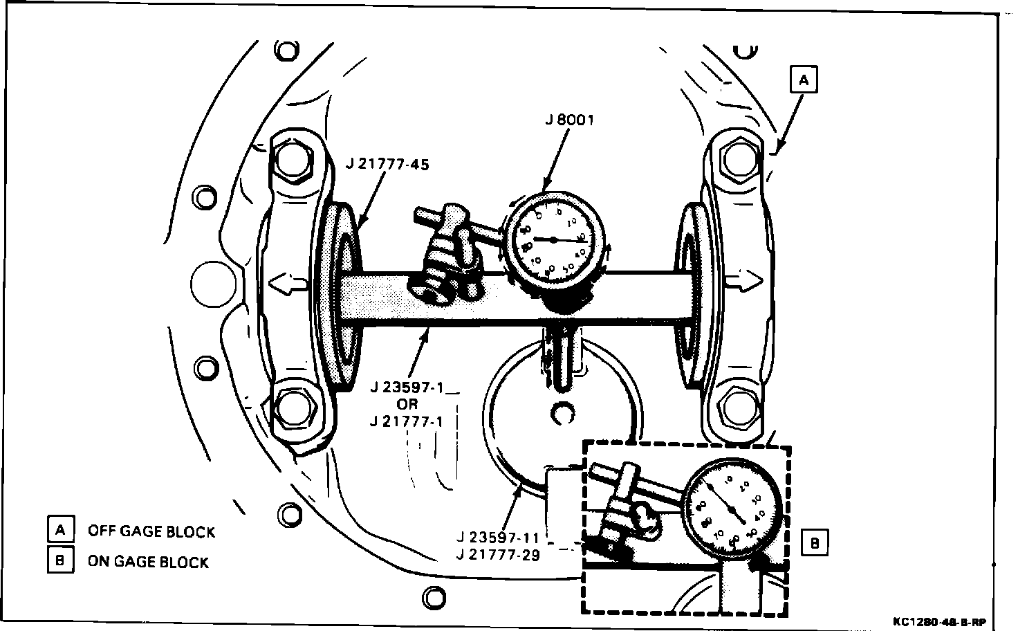 vMeasure ^Pinion depth. ^Rotate J 23597-1 or J 21777-1 slowly back and forth until J 8001 reads the greatest deflection (the point where the needle changes direction). At that point, set J 8001 to zero. Repeat rock action to verify the zero setting. ^After zero setting is obtained, rotate J 23597-1 or J21777-1 just until the plunger no longer touches J 23597-11 or J 21777-29. This provides the gaging reference of a "nominal" or "zero" pinion. ^Record J 8001 reading at pointer position. This indicates the proper shim to use