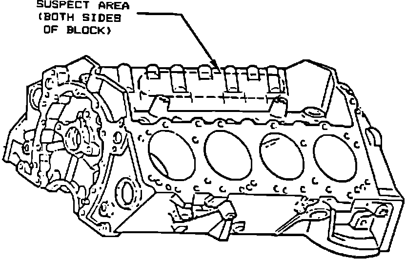 Inspection can be accomplished in two manners. The first method involves removal of the intake manifold and direct visual inspection of the walls of the galley. Particular attention should be given to the areas of the galley within the first few inches below the deck (as Illustrated). A casting parting line may also be evident in this area and should not be mistaken for a crack. If an area looks suspect, cracks can be more positively identified by use of a commercially available penetrant dye such as magnaflux "spotcheck".