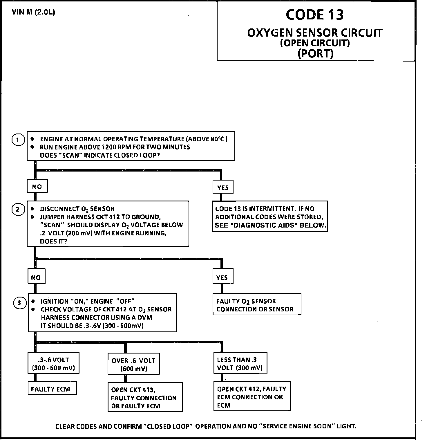 Normal "Scan" voltage varies between 100 mV to 999 mV (.1 and 1.0 volt), while in "Closed Loop." Code 13 will set in 3 seconds, if all criteria have been met and the system will go "Open Loop." Refer to "DIAGNOSIS BY SYMPTOMS - NO TROUBLE CODE STORED".