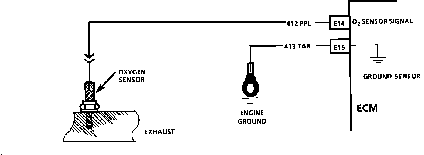 The electronic control module (ECM) supplies a voltage of about .45 volts between terminals "El4" and "E15". (If measured with a 10 megohm digital voltmeter, this may read as low as .32 volt.) The 02 sensor varies the voltage, within a range of about 1 volt if the exhaust is rich, down through about .10 volt if exhaust is lean. The sensor is like an open circuit and produces no voltage when it is below 360"C (600F). An open sensor circuit or cold sensor causes "Open Loop" operation.