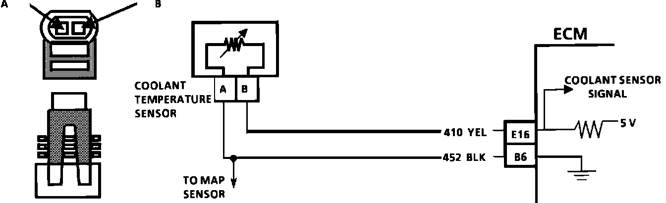 The coolant temperature sensor uses a thermistor to control the signal voltage to the ECM. The ECM applies a voltage on CKT 410 to the sensor. When the engine is cold, the sensor (thermistor) resistance is high, therefore,