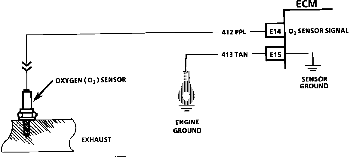 The electronic control module (ECM) supplies a voltage of about .45 volt between terminals "E14" and "E15". (If measured with a 10 megohm digital voltmeter, this may read as low as .32 volt.) The 02 sensor varies the voltage within a range of about 1 volt if the exhaust is rich, down through about .10 volt if exhaust is lean. The sensor is like an open circuit and produces no voltage when it is below about 360 degrees C (600 degrees F). An open sensor circuit or cold sensor causes "Open Loop" operation.