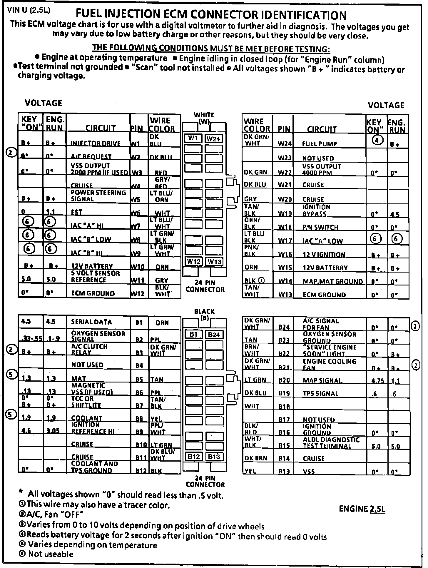 Fig. 020 ECM Connector Terminal I.D. & Volt. Specifications: