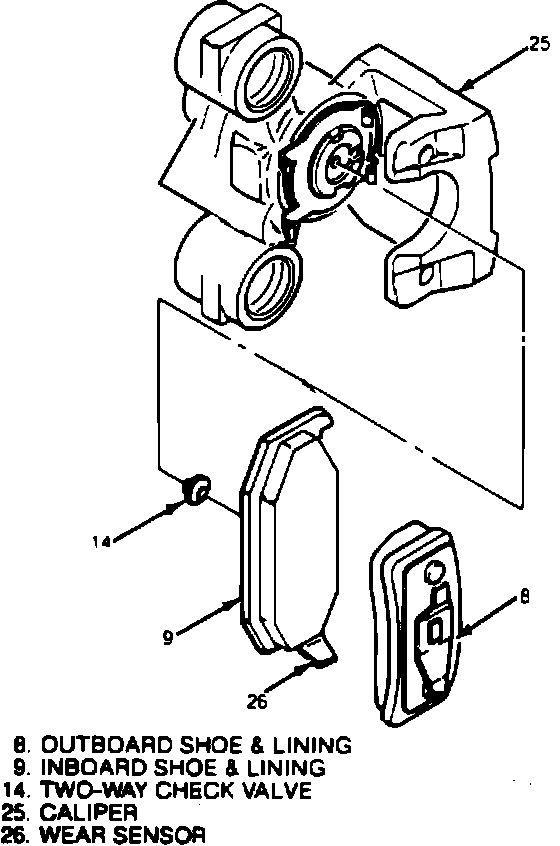 2. Outboard shoe and lining. Use a screwdriver to disengage buttons on shoe from holes in caliper housing.
