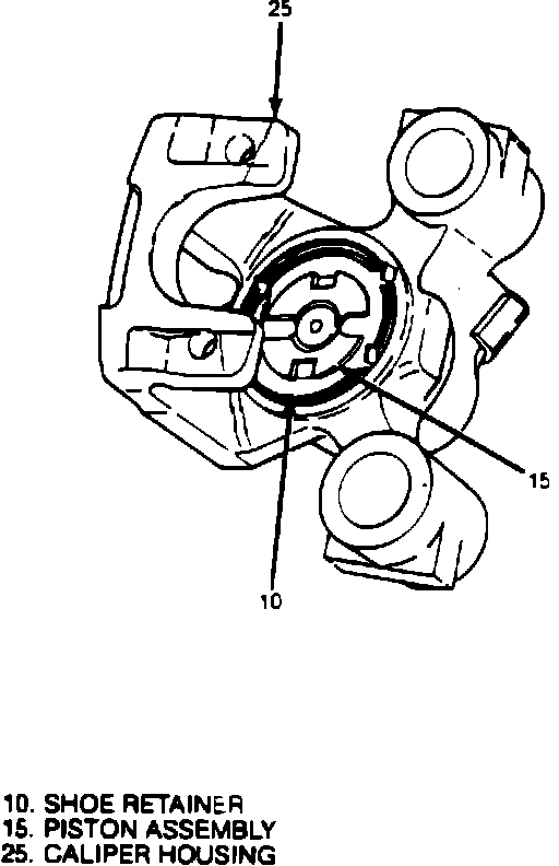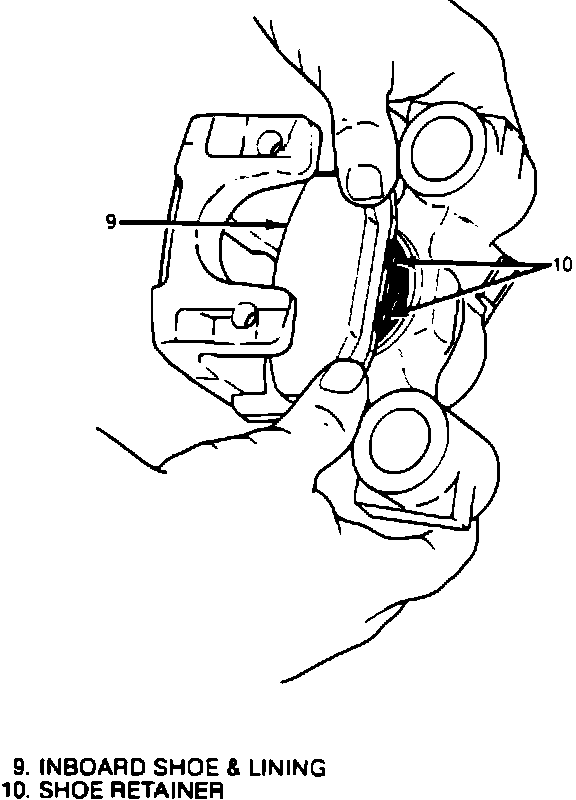 3. Inboard shoe and lining. From open side of caliper, press in on edge of inboard shoe and tilt outward to release shoe from shoe retainer.