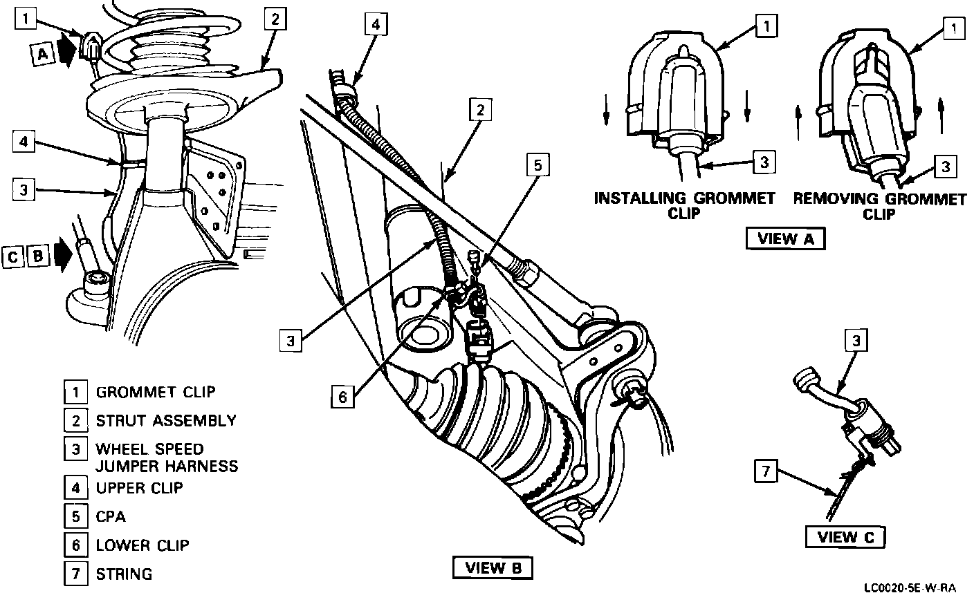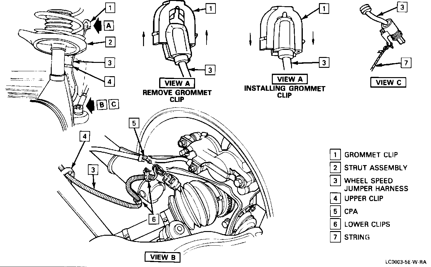 2. Jumper harness at wheel speed sensor, by removing connector position assurance (CPA) locking pin, open jumper harness retaining clip, removing grommet retainer, and push grommet through opening in strut tower.