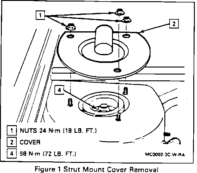 2. Strut mount cover plate (2) by removing three cover plate nuts (1), refer to Figure 1.