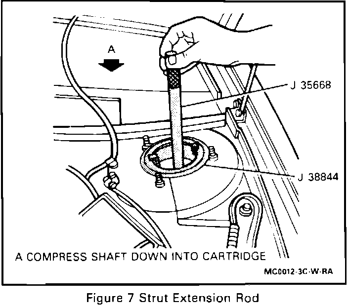 The following procedure has been revised to include a new special tool (J 38844). J 38844 will be shipped as part of the 1991 Essential Tool Program.This tool was developed to eliminate the possibility of the front suspension spring moving out of alignment when removing the strut cartridge.