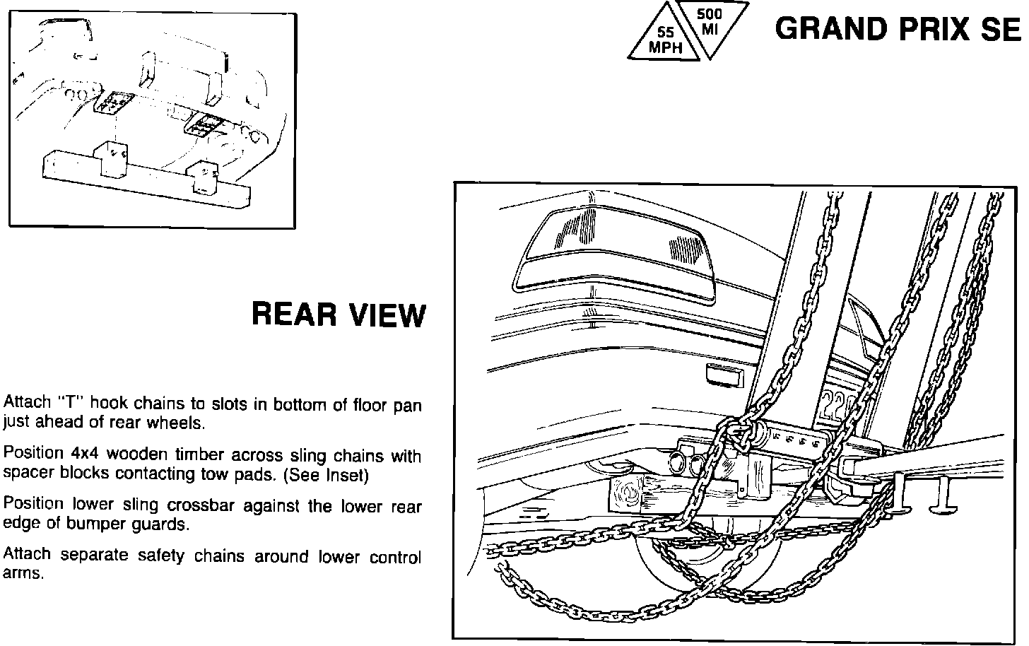 Attach "T" hook chains to slots in bottom of floor pan just ahead of rear wheels. Position 4 X 4 wooden timber across sling chains with spacer blocks contacting tow pads. (See Illustration).